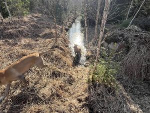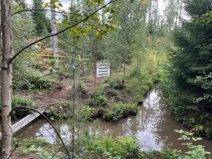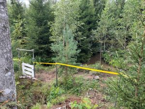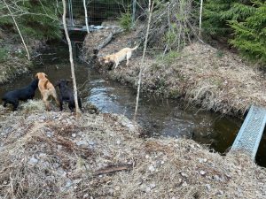 - Aluetta halkoo myös metsäoja, mikä tuo virkistävän vesielementin Sinun Koirametsään. Alue on aidattu rakennusaita-elementeillä, joiden isoin silmäkoko on L:10cm K:26cm. Aidan alaosassa on lisäksi sisäpuolella metrin korkuinen lammasaita pienemmällä silmäkoolla, joten pienimmätkin karvakamut pysyvät aidan sisäpuolella.